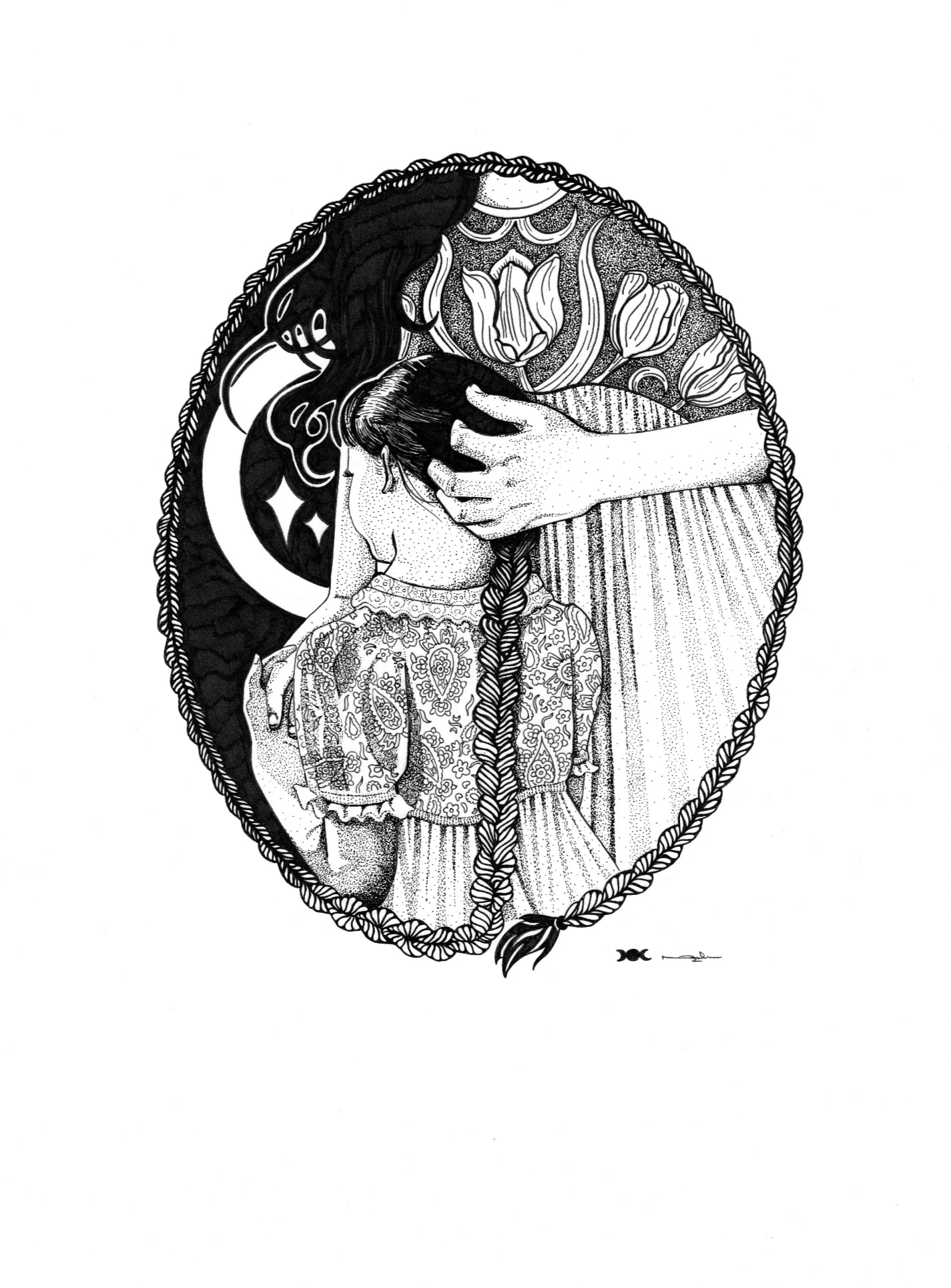 As I started drawing her, I noticed a beauty within her. Alike the Death tarot card, she is seen as scary. With her flowing dress, I see her as a symbol of powerful transformation and new beginnings. A sign of personal growth, renewal and the cycle of life and death.
