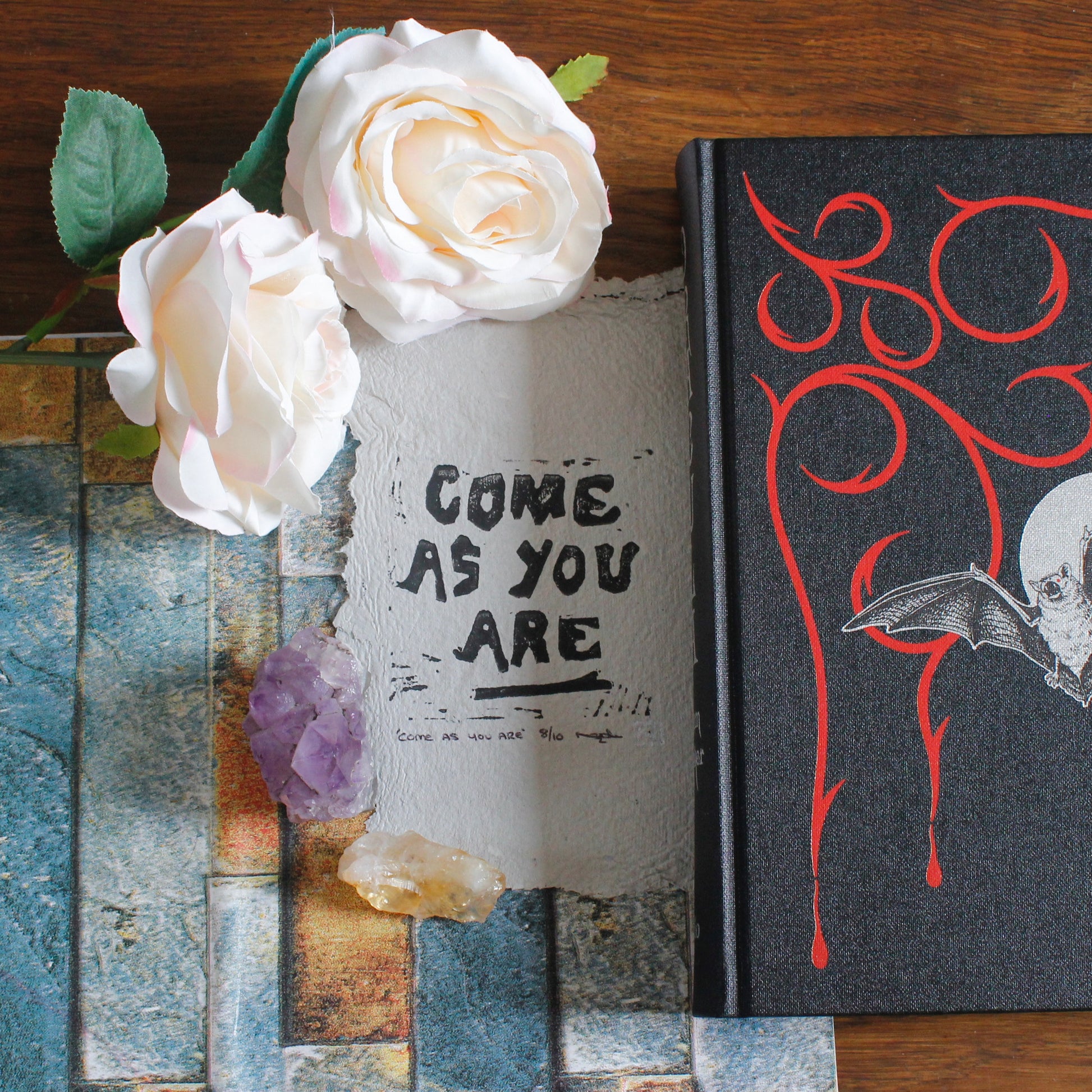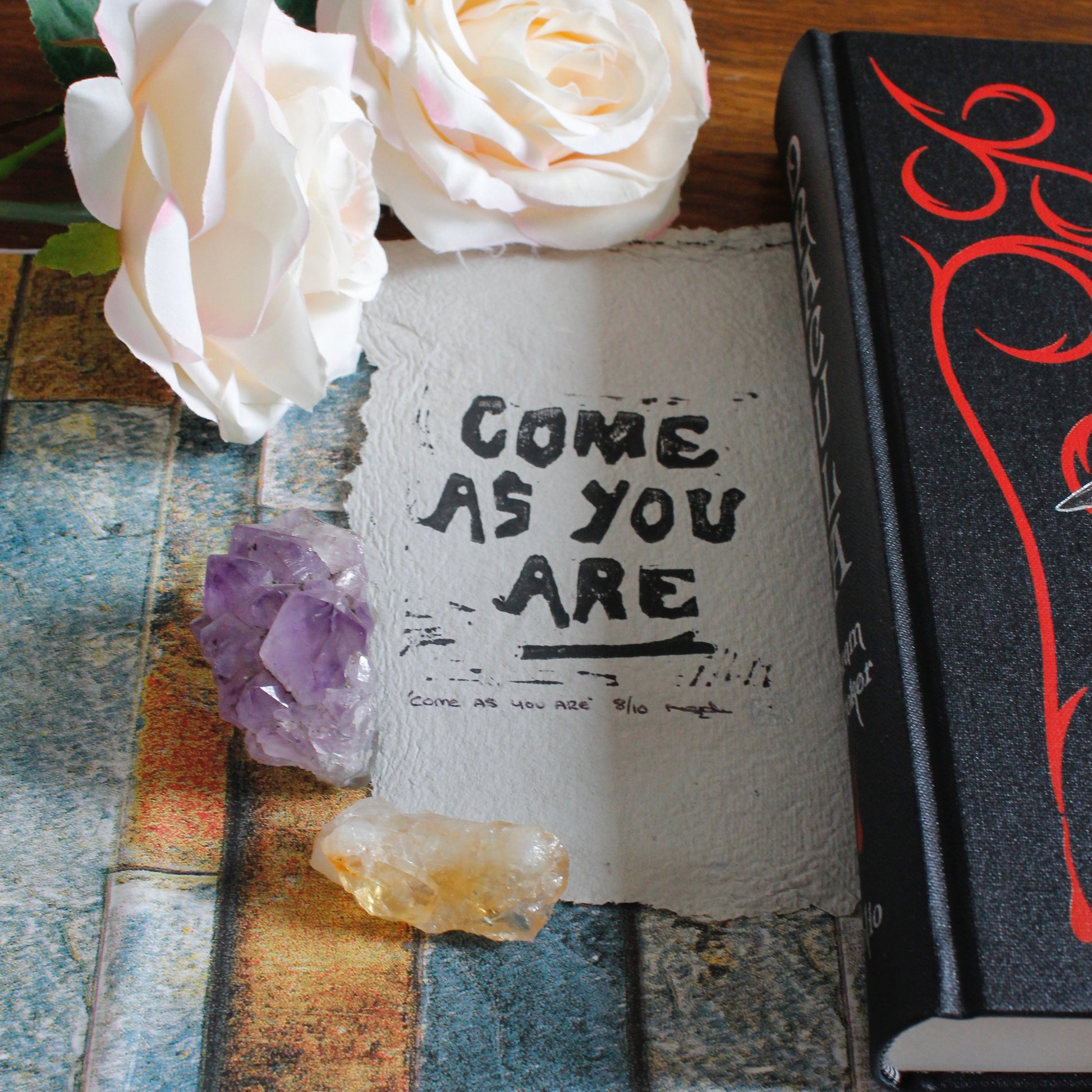 ‘Come as you are’ lino print printed onto handmade paper, made from old newspapers.